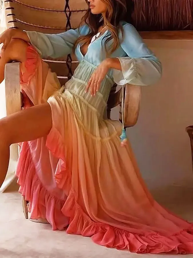 Deep V Irregular Lace Gradient Dress