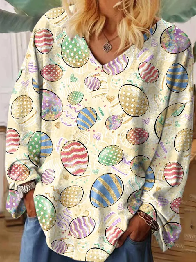 Easter Egg Print V-Neck Oversized Top