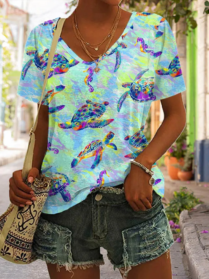 🔥Buy 3 Get 10% Off🔥Holiday Turtle Print Short Sleeve Top